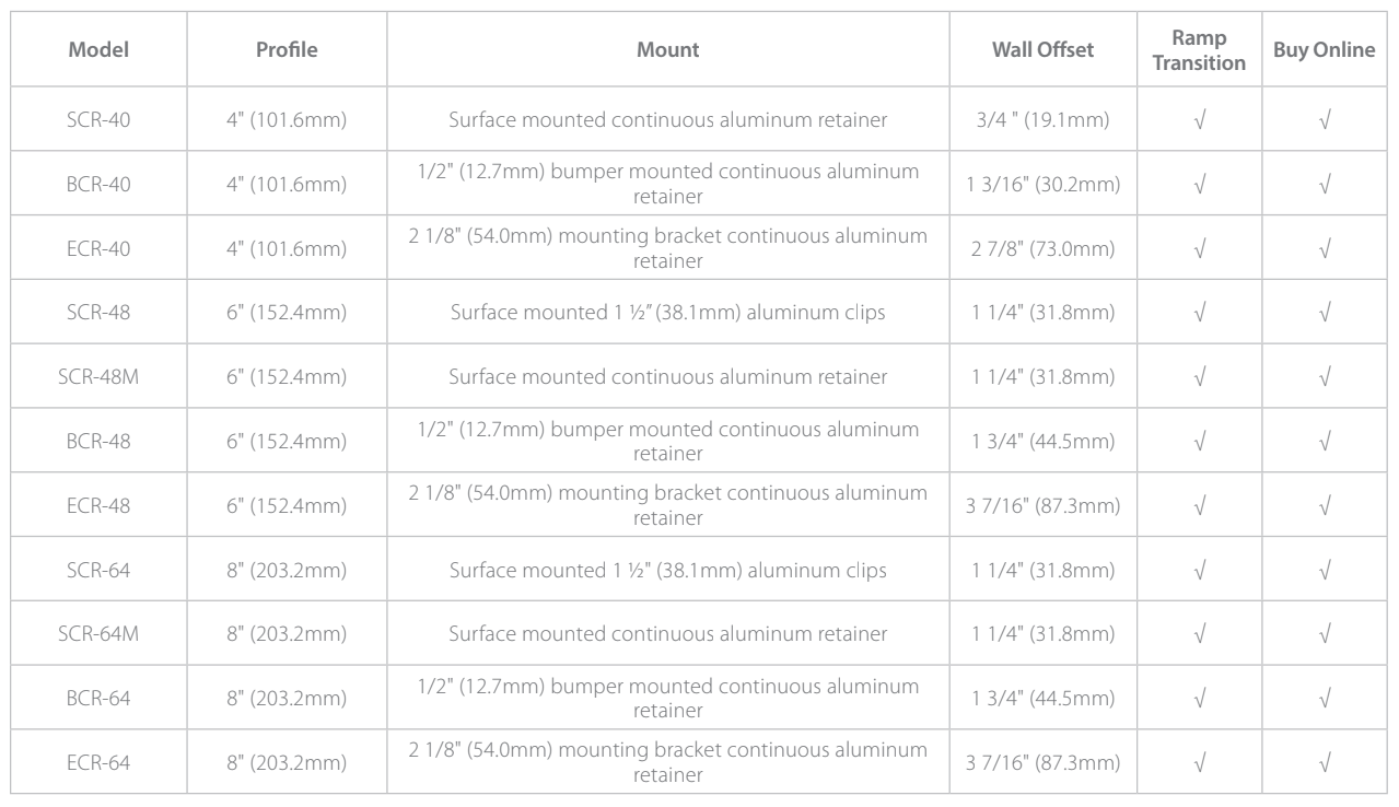The SCR-F series of crash rails provide impact resistance with a continuous aluminum retainer or aluminum clips. For additional shock absorption, choose from three mounting options.