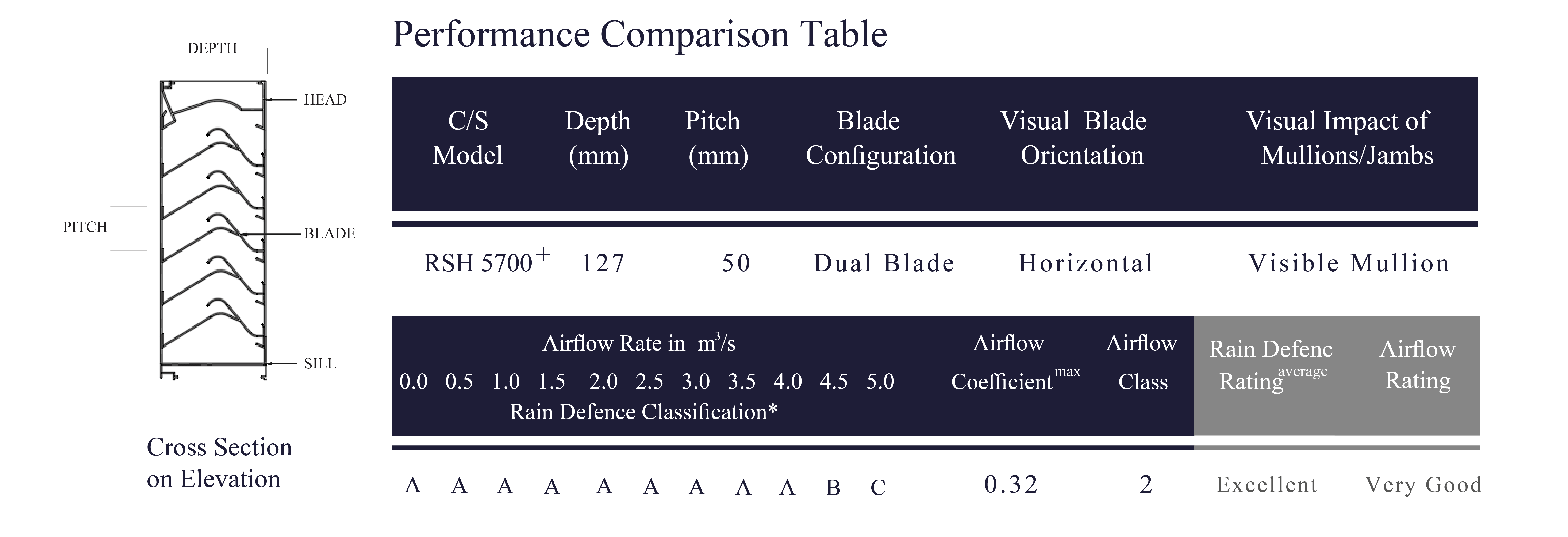 Model RSH-5700 is a 5" storm resistant, horizontal mullion louver. This louver is tested and certified by AMCA.