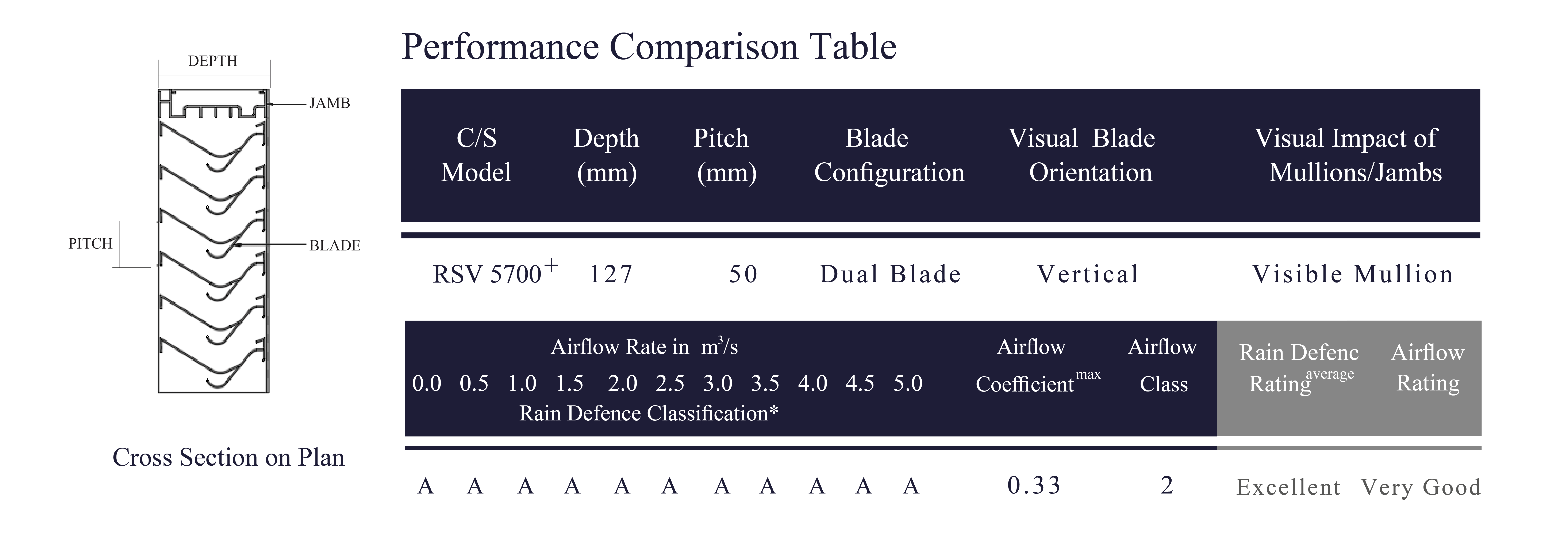 Model RSV-5700 is a 5" storm resistant, vertical continuous line louver. This louver is tested and certified by AMCA.